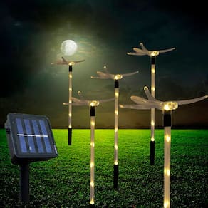 O conjunto de luzes de Natal apresenta 5 luzes de Libélulas e está equipado com um painel solar. Coloque o painel solar em uma área bem iluminada, e após 4-6 horas de carregamento de luz solar direta, estas luzes de Libélulas podem iluminar você por 8 a 12 horas à noite. Com um interruptor automático, as luzes podem ligar automaticamente ao anoitecer e desligar ao amanhecer.