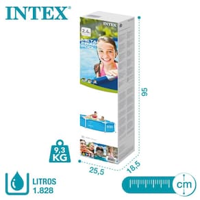 Características: Marca: Intex Referencia: 28205 Moldura metálica tubular redonda Diâmetro de 244 cm e altura de 51 cm Design exterior em azul Lona feita de três camadas laminadas de PVC-Poliéster. Capacidade para 1.828 litros. Possui entrada para bomba filtrante (não acompanha bomba) Recomendado para 2 pessoas com mais de 6 anos de idade Espaço mínimo recomendado para a piscina: 3,44 x 3,44 metros. Peso da caixa: 9,3 Kg.