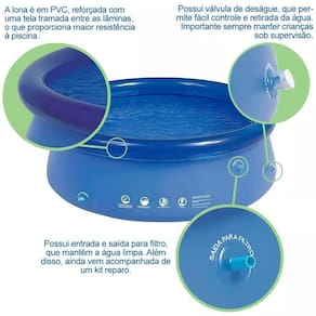 - Incluso na embalagem: 01 Piscina, 01 Bomba de Ar Manual, 01 Bomba Filtrante 2.200L/H 110v, 01 Manual de Instruções e 01 Kit Reparo;