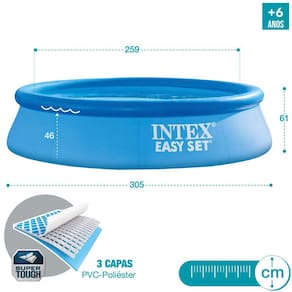 Características: Marca: Intex Referência: 28116 Material: PVC de alta resistência estampada com tinta não toxica Montagem rápida e fácil Possui válvula de escoamento Capacidade de 3.077 Litros (90% da capacidade de água) Dimensões: 305 cm de diâmetro x 61 cm de altura Acompanha bomba de encher