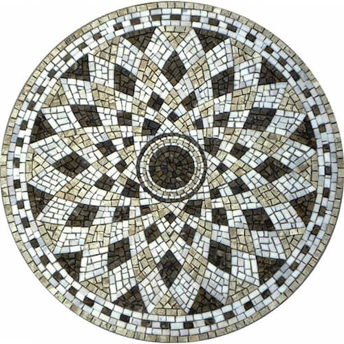 Especificações técnicas do mosaico: Feito com pedras - Mármores e granitos de todo o Brasil e importados da Europa e Ásia - para obter todas as cores desejadas em pedras naturais; Vem todo montado sobre tela, só colocar conforme manual de colocação, Resistência e Durabilidade em área interna e externa; Espessura de 10 mm Mesma espessura do porcelanato ou piso cerâmico Liso e agradável para uso diário; Mosaico feito integralmente à mão com técnica do mosaico romano;
