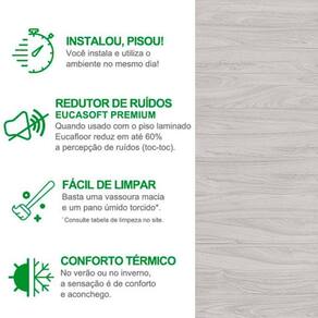 Recomendações de Uso, Manutenção e Limpeza: A limpeza deve ser feita com aspirador de pó (exceto aspiradores com tubo de sucção que raspam o piso) ou vassoura de cerdas macias e um pano úmido bem torcido em solução de produtos domésticos de limpeza isentos de cera ou silicone. Eventualmente (uma vez por semana), a limpeza poderá ser feita diluindo uma ou duas tampas do Pratice Limpador de Laminados ou detergente neutro em 1 litro d'água. Molhe o pano nesta mistura, torça-o bem e aplique sobre o piso.Nunca utilize material cortante ou abrasivo, cera ou enceradeiras elétricas, esponja de aço, lixa ou produtos à base de silicone