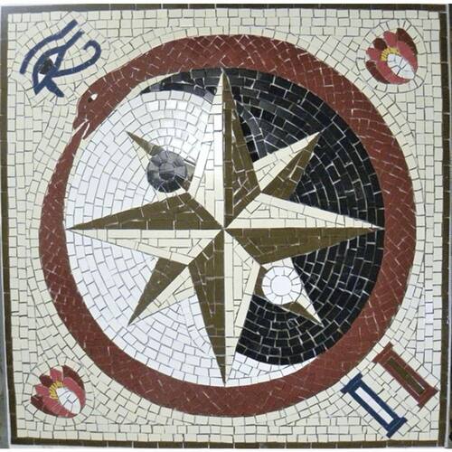 O piso Maçônico é rico em simbolismo de várias culturas incorporadas ao longo da história da Maçonaria. Ele apresenta símbolos egípcios, hebraicos e renascentistas. O destaque principal é a rosa dos ventos, símbolo antigo que representa orientação espiritual, domínio do espaço e conhecimento. Ela está acompanhada pelo Yin e Yang oriental, que promove equilíbrio e a compreensão de que nenhum polo é completamente puro. O Ouroboros grego, cercando a estrutura, simboliza o ciclo eterno de evolução. Duas flores de lótus nos cantos representam a luz espiritual inerente a cada indivíduo, semelhante à planta que emerge pura do lodo do rio Nilo. O olho de Ísis oferece proteção e cuidado universal. Por fim, as colunas Jaquim e Boaz, típicas da Maçonaria, simbolizam força e sabedoria, lembrando a importância de buscar o aumento do conhecimento e da força espiritual para prosperar.