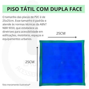 As placas de piso tátil são fabricadas em PVC, um material plástico durável e resistente ao desgaste. O PVC é leve e fácil de manipular, tornando a instalação mais conveniente. Cada placa segue as normas técnicas da ABNT NBR 9050 para acessibilidade em edificações e espaços públicos, medindo 25x25cm.