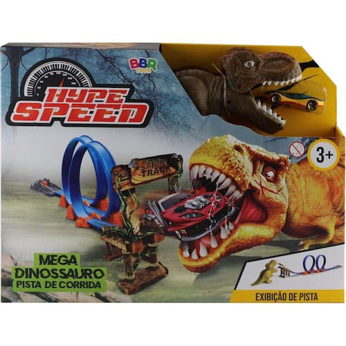 Contém: 1 Pista com 1 Looping 360°, 1 Dinossauro, 1 Plataforma que parece madeira, 1 Plataforma de Lançamento e 1 Carrinho.