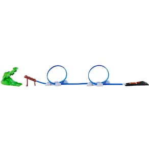 A diversão não vai ter fim com essa incrível pista de corrida Mega Crocodilo, com o lançador de carrinhos você poderá acabar com o Mega Crocodilo. O lançador é puncionado por elástico e acionado por meio do botão, a cabeça do obstáculo Mega Crocodilo saí dependendo da força em que o carrinho é acelerado.