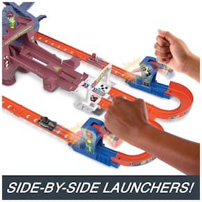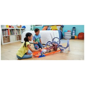 O conjunto de pistas Hot Wheels RacerVerse SpiderMan é uma emocionante corrida multivoltas entre o Homem Aranha e o Pantera Negra. As crianças podem lançar os veículos fundidos dos personagens em um loop e em torno das curvas cinco vezes. O primeiro lugar garante a vitória, enquanto o segundo colocado é derrubado da pista pelas garras móveis do vilão Doc Ock quando a ponte desaba. O conjunto é fácil de desmontar para armazenamento. Os veículos fundidos sob pressão Hot Wheels RacerVerse SpiderMan e Hot Wheels RacerVerse Black Panther incluídos no conjunto têm detalhes autênticos que são adorados por colecionadores e crianças. O conjunto é um ótimo presente para fãs do Homem Aranha e crianças com 4 anos ou mais.