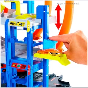 A Pista Garagem Mega Loop Hot Wheels City tem três níveis de brincadeira centradas no carro para envolver os jovens pilotos em narrativas imaginarias e acrobacias épicas. No piso da base desse conjunto, as crianças podem dirigir seu carro em um lava-rápido que apresenta um rolo de espuma móvel e uma cortina de lavagem. Em seguida, você pode carregar o carro no lançador e enviá-lo para o loop duplo, onde os desviadores ajudam a guiá-lo até o andar desejado. Você pode usar o elevador ou usar o helicóptero de transporte de carros para transportar os veículos para qualquer nível para estacionamento. A brincadeira pode ser ampliada usando os conectores Pista Speed Snap. Um carro de brinquedo die-cast da Hot Wheels e um helicóptero de brinquedo estão incluídos. Veículos e pistas adicionais são vendidos separadamente.