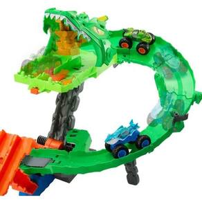 Este conjunto da Mattel inclui a pista de destruição do dragão e dois Monster Trucks em escala 1:64: Great Bite e Rageasaur.