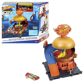 Depois de lutar contra criaturas más do Hot Wheels City, faça uma parada para comer algo a Pista Hot Wheels Lanchonete de Hambúrgueres. Você pode girar a placa com o logotipo e os carros passarão pelo drive-thru automaticamente, mas cuidado. Há evidências de que as criaturas também farão uma paradinha. Mova o dispersor de ketchup e cruze sobre as chamas da grelha antes de acelerar para outras aventuras. Veja o menu e o portão móvel em forma de espátula.O brinquedo tem dimensões aproximadas de 25,4x21,59x7,62cm e inclui 1 pista Hot Wheels Lanchonete de Hambúrgueres e 1 carro Hot Wheels. Conecte-se a outros conjuntos e pistas Hot Wheels por meio de diversos pontos de conexão para construir um mundo único de diversão e aventura, cheio de recursos incríveis.