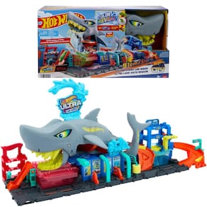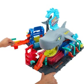 Uma aventura insana e cheia de adrenalina está prestes a começar! Como apresentado na série da Netflix, "Velocidade Máxima!", o Hot Wheels City Lava-Rápido Mega Tubarão foi tomado por um enorme tubarão que está querendo mergulhar em uma ação radical de mudança de cor! As crianças dirigem o veículo Color Reveal incluído sobre a rampa e na boca do tubarão, depois pressionam a cabeça do tubarão para mudar a cor na água e revelar a decoração do carro. Puxar o tubarão para cima permite que você veja o carro correr por suas entranhas enquanto o excesso de água é drenado. Tocar na cauda do tubarão permite lançar os carros da garagem ou no tanque de água gelada para uma surpresa de mudança de cor. Você pode mudar as cores do carro de volta ao passar pela lavagem novamente. O jogo de pista detalhado na base aprimora a narrativa com portões móveis e um rolo de espuma que se assemelha a um lava-rápido da vida real. O conjunto se dobra ao meio para facilitar o armazenamento e inclui uma alça para ajudar a transportá-lo e drenar o excesso de água. Um veículo Hot Wheels Color Reveal está incluído. As cores e as decorações podem variar. Interação com água deve ser feita sempre sob a supervisão de um adulto. A Pista Hot Wheels City Lava-Rápido Mega Tubarão permite que você mergulhe para brincar de mudar de cor do carrinho em um local apresentado na série da Netflix, "Velocidade Máxima!". As crianças podem dirigir o Hot Wheels até a boca do tubarão e pressionar sua cabeça para iniciar a primeira revelação. A água muda de cor à medida que a tinta especial Color Reveal é lavada, expondo a decoração do carro! Levantar o tubarão permite ver o carro correr pela Pista através de seu interior. Uma abertura na parte inferior permite que as crianças vejam a transformação do carro. Cada conjunto se conecta com outras pistas Hot Wheels (vendidos separadamente) para criar um mundo do seu jeito, cheio de ação e aventuras! Hora de iniciar uma ação de corridas sem fim com nossa coleção épica de diecast Hot Wheels, conjuntos de pistas, Monster Trucks, veículos R/C e muito mais. Prova aceita!