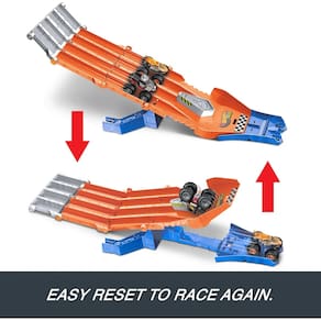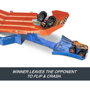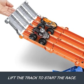 Os Monster Trucks Mega-Wrex e Tiger Shark da Hot Wheels se enfrentam em uma corrida de descida onde um desviador decide aleatoriamente quem vencerá e quem capotará e baterá. Você pode colocar os caminhões de brinquedo em escala 1:64 incluídos na posição de partida e, em seguida, levantá-los para enviá-los em alta velocidade para a linha de chegada. A distribuição aleatória permite que um caminhão corra, enquanto o outro vira de volta para a pista em um acidente incrível. O conjunto pode ser conectado a outras pistas Hot Wheels com conectores Speed Snap e também é compatível com outros carros e caminhões Hot Wheels em escala 1:64. Pista e veículos adicionais vendidos separadamente. As cores e as decorações podem variar.No conjunto Hot Wheels Monster Trucks Corrida de Destruição, Mega-Wrex e Tiger Shark competem para ver quem é o mais rápido e quem vai bater.Você pode carregar os Monster Trucks em escala 1:64 incluídos na largada com queda por gravidade para enviá-los para baixo da colina. O desviador seleciona aleatoriamente quem ficará para trás e quem poderá continuar correndo.As crianças podem usar outros carros e caminhões de brinquedo em escala 1:64 para correr com até 4 veículos ao mesmo tempo (o conjunto inclui um Mega-Wrex e um Tiger Shark em escala 1:64. Veículos adicionais são vendidos separadamente)!O conjunto é inspirado na série Tubarões vs. Dinossauros do YouTube Kids, permitindo que as crianças encenem suas histórias favoritas e inventem novas histórias em casa.Você pode conectar mais pistas com os conectores Speed Snap para continuar as aventuras de corrida (pista adicional vendida separadamente).As crianças a partir de 4 anos de idade vão adorar as corridas de alta velocidade e as histórias com os personagens favoritos de Monster Trucks, Mega-Wrex e Tiger Shark.