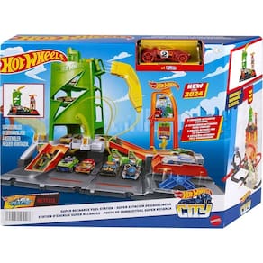 Dirija até a estação de combustível Hot Wheels City Super Recharge para brincadeiras dinâmicas com veículos Hot Wheels