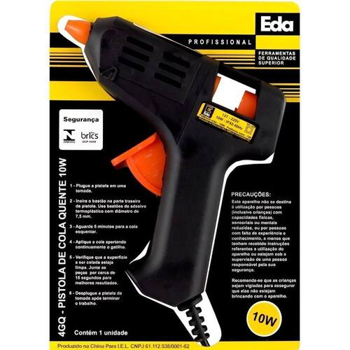 Pistola De Cola Quente 10 Watts - 4gq - Eda Pistola de Cola Quente 10 Watts - 4GQ - EDA Descrição: De qualidade insuperável a Pistola de Cola Quente da Eda, possui potência de 10 Watts, atendendo a todas as atividades que você precisa realizar, sendo ideal para colagem de papel, plástico, madeira e cerâmica. Ainda tem a capacidade de ser utilizada para fixação de componentes em placas, fixação de conectores, canaletas, molduras e entre outros. Ele proporciona uma aplicação rápida e eficiente, tornando tudo mais prático!