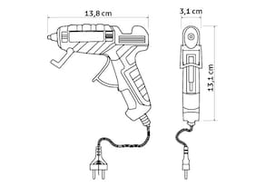 Possui corpo em plástico leve e ponta de alumínio com proteção em borracha, garantindo mais segurança e controle durante o uso. Trabalha na faixa de 170 °C a 190 °C e utiliza bastões de cola de 7,2 mm.