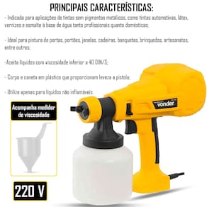 Indicada para aplicações profissionais e domésticas de tintas sem pigmentos metálicos, como tintas automotivas, látex, vernizes, esmalte à base sintética e à base de água. Ideal para pintura de portas, portões, janelas, cadeiras, banquetas, brinquedos, artesanatos, entre outros. Aceita líquidos com viscosidade inferior a 40 DIN/S (acompanha medidor de viscosidade). Modo de utilização do medidor: deve-se tampar o furo inferior do medidor, encher o medidor com o líquido que será utilizado, liberar a saída do líquido pelo furo inferior e marcar o tempo. O líquido deve escorrer totalmente em 40 segundos ou menos. Caso exceda o tempo previsto, significa que o líquido é mais espesso do que 40 DIN/S, o que acarretará no travamento e queima da pistola.