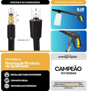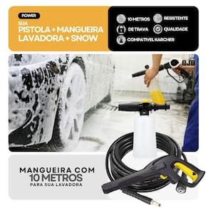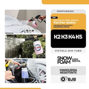 Ferramenta de aplicação Gatilho G145 para Lavadoras Karcher K2 / K3 / K4 / K5 - Código 93130120 + Mangueira com 10 metros + Snow foam A Ferramenta de aplicação G145 da Karcher é a ideal para sua lavadora de alta pressão da linha K. Compatível com os modelos K3, K4 e K5, essa empunhadeira foi desenvolvida com acabamento de alta qualidade e excelente durabilidade, garantindo um desempenho confiável por muito mais tempo. Conta com sistema de engate rápido, que facilita a conexão com a lavadora, além de um botão com trava de segurança que evita acionamentos acidentais, oferecendo mais controle e segurança durante o uso. Características Técnicas Ferramenta de aplicação: Produto: Ferramenta de aplicação com gatilho modelo G145 Encaixe: Tipo engate rápido com botão Código do fabricante: 93130120 / 9.313-012.0 Marca: Karcher Aplicação: Lavadora de alta pressão lavajato Características Técnicas Mangueira: 10 metros Características Snow foam: Compativel com Ferramenta de aplicação Marca: Bjb Equipamentos
