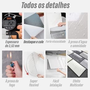 Cada placa contém material de espuma de polietileno/PVC, oferecendo uma aplicação autoadesiva, destacável e de fácil aplicação. Com uma largura de 60 cm e altura de 30 cm, cada placa cobre uma área de 0,18 m², sendo ideal para ambientes internos e externos cobertos.