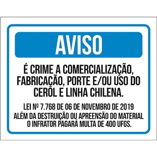 Placa Aviso - É Crime Uso Porte De Cerol Linha Chilena 36x46 - Informações do Produto: Placas decorativas fabricadas com poliestireno de alto impacto PSAI de 2mm e adesivo vinil automotivo de alta performance. - Medidas: 36cm x 46cm - Fixação: Todas as placas possuem adesivo dupla face para aplicação em qualquer tipo de superfície lisa. de 12 meses e disponibilidade imediata. Marca: Não Informado