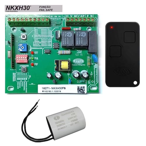 Itens inclusos: 01 Central Placa Motor NKxh30fs Sensor Hall Rossi 01 Capacitor de Partida 25UF 127V 01 Controle 2 Canais NTX Preto 01 Manual do Usuário