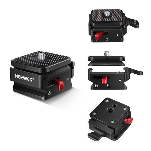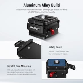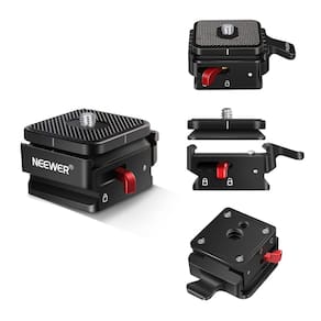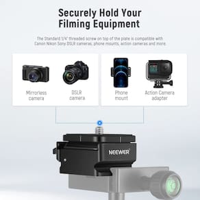 O adaptador de montagem em placa de liberação rápida NEEWER conecta facilmente sua câmera ou outro equipamento a um tripé, monopé, estabilizador, controle deslizante, etc. Possui um slot em estilo arca, combinado com um orifício de parafuso de 1/4” e 3/8”, a placa QR se encaixa perfeitamente na maioria dos tripés do mercado.