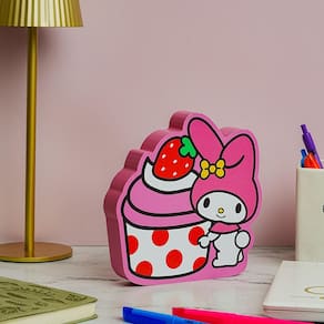 - MY MELODY: Placa de parede apresenta My Melody ao lado de um adorável cupcake de morango. A placa de parede é completa com uma borda rosa.