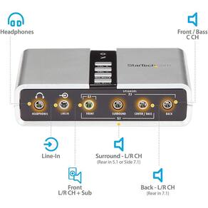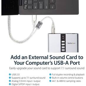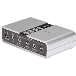 Esta placa de som USB 7.1 oferece uma solução de alta qualidade para atualizar o som de desktop ou laptop. Solução de áudio pronta para o Home Theater Fornecendo uma experiência de áudio USB robusta, a placa de som externa para seu laptop ou PC se conecta a um computador hospedeiro através de uma única conexão USB 2.0, para oferecer impressionante capacidade de áudio externo que pode ser instantaneamente trocada entre sistemas, sem ter que abrir a caixa do computador para instalação. Solução de economia de custos Suportando áudio analógico e digital para aplicativos de áudio de 2 a 7,1 canais, a placa de som de saída SPDIF fornece uma atualização econômica do som embutido/on-board que transforma o som desktop/laptop em uma solução de áudio pronta para home theater. O adaptador de áudio para USB possui controle de volume fácil de usar e duas entradas externas de microfone, para aplicações que requerem som de alta qualidade com capacidade de multi-entrada com suporte para taxas de amostragem de 44,1 KHz e 48 KHz para reprodução e gravação analógica ou 48 KHz para SPDIF. Fácil configuração Uma solução mais do que adequada para apresentações de home theater, jogos ou multi-mídia, a Placa de Som USB Externa é fácil de instalar com suporte de plug and play nos sistemas operacionais ows XP e ows Vista. O adaptador de áudio estéreo USB é apoiado pela nossa garantia de 2 anos e suporte técnico vitalício . Nota: A porta de passagem óptica SPDIF do adaptador de áudio suporta áudio de dois canais, esta porta não suporta áudio 5.1 ou 7.1.