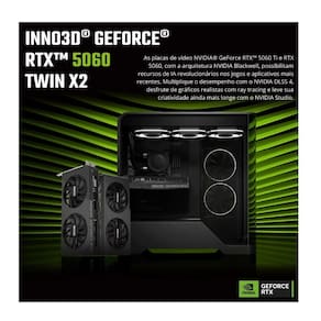 A Placa de Vídeo INNO3D GeForce RTX 5060 Twin X2 oferece alto desempenho para jogos e aplicações gráficas modernas, equipada com 8GB de memória GDDR7 e interface de 128 bits para excelente velocidade e fluidez. Seu sistema de refrigeração com duas ventoinhas garante eficiência térmica e funcionamento estável, enquanto tecnologias como Ray Tracing e DLSS proporcionam gráficos mais realistas e maior performance. Ideal para gamers e criadores de conteúdo que buscam potência, eficiência e ótimo custo-benefício em um design compacto.