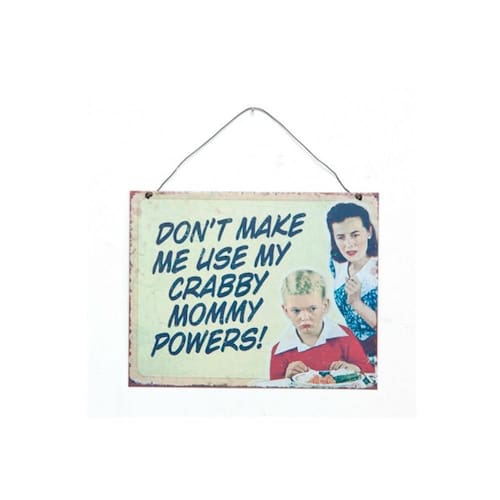 Feita em metal e tem estampa da frase em inglês: 'Don't make me use my crabby mommy powers'. Tradução: 'Não me faça usar meus poderes de mamãe ranzinza'.