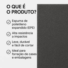 Placa Ethafoam 1 Unidade EPE Espuma P/Case 60x50x3cm Grafite Descrição Se você precisa proteger objetos delicados no transporte ou na armazenagem, essa placa de espuma EPE polietileno expandido é a solução ideal Perfeita para forrar o interior de cases, maletas, embalagens técnicas, caixas organizadoras e muito mais. Como usar: Basta medir o interior do seu case ou maleta, cortar a espuma no tamanho desejado com estilete ou tesoura, e encaixar. Você pode também esculpir o formato exato do item que deseja proteger, garantindo um encaixe preciso e seguro. Dica: Use camadas de espuma para proteger equipamentos maiores ou mais frágeis, como instrumentos musicais, câmeras, drones, ferramentas e aparelhos eletrônicos. A densidade da espuma ajuda a absorver impactos e evitar danos. vantagens do produto: Alta resistência a impactos Leve, durável e fácil de manusear Pode ser moldada conforme a necessidade Células fechadas: não absorve umidade Cor grafite: visual discreto e profissional Seja para ou pessoal, essa placa de espuma é uma escolha inteligente para quem valoriza organização, segurança e acabamento de qualidade. Dimensões: Espessura: 3cm Largura: 50cm Comprimento: 60cm Contéudo: 1x Placa Ethafoam EPE Espuma Para Case 60x50x3cm Grafite Marca: Não Informado