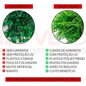 Placa Jardim Vertical Amazonia Revestimento Artificial Casa Renove seu espaço com o Jardim Vertical Único com Proteção UV Peças 25x25cm, ideais para interiores e exteriores. Garantimos cores vibrantes sem desbotar. Possuem moldura ultra-flexível com conectores de intertravamento que facilitam a instalação - é só encaixar um painel no outro para montar lindos ambientes Os painéis verdes tem excelente durabilidade em ambientes externos por serem resistentes a variações climáticas. Também, não precisam de manutenção poda e irrigação . Material: Polietileno de Alta Densidade Dimensão da Placa: 25cm x 25cm Quantidade por Embalagem: 1 placa de 25cm x 25cm Uso: Interno e Externo Instalação: Abraçadeira Nylon Qualidade superior: Plantas permanentes que imitam perfeitamente as naturais, mantendo o visual fresco o ano todo. Durabilidade incrível: Superior a 10 e oferecemos 5 anos de de fábrica para áreas externas e 10 anos para internas. Proteção UV: Cores vibrantes que não desbotam, ideais para áreas internas e externas. Manutenção fácil: Sem necessidade de rega ou poda. Versatilidade: Fácil de instalar em qualquer superfície, adaptável a diversos ambientes. Sustentabilidade: Feito com materiais recicláveis e duráveis, uma escolha ecológica. Moldura ultra-flexível: Conectores de intertravamento para uma montagem simples e rápida. Fazem o encaixe perfeito uma na outra. Quantas placas preciso para cobrir 1m Resposta: Será necessario 16 placas para preencher a metragem de 1m. Como é feito a instalações Resposta: A instalação é feita com Abraçadeira de Nylon ou parafusos. Pode ser instalado na área externa Resposta: Sim, pode ser instalado na área interna e externa; A cobre quanto tempo Resposta: A cobre 5 anos para área externa e 10 anos para área interna porém a durabilidade é superior. Somos a Lujp Decorações, apaixonados por revestimentos e elementos 3D. Criamos ambientes únicos e inspiradores com foco na qualidade. Oferecemos uma variedade de produtos e serviços para transformar espaços e surpreender nossos clientes. Marca: Não Informado