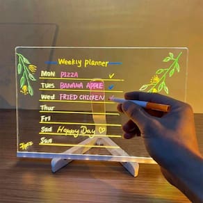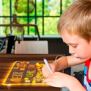 CaracterísticasMaterial em acrílico e em plásticoMedidas: Altura 20cm x Largura 30cmTipo de alimentação: USBIluminação LED que destaca o desenhoPerfeita para adultos e crianças se divertirem enquanto decoram o ambienteEmbalagem:1x Placa para desenhar1x Kit marcadores com 7 canetas coloridas1x Suporte1x Cabo USB LED