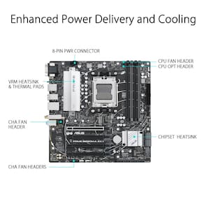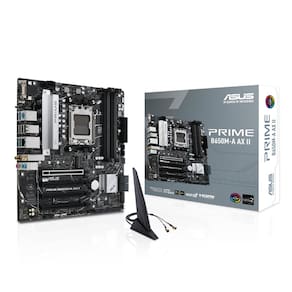 Placa-mãe ASUS Prime B650M-A AX II AMD B650 AM5 Ryzen™ Desktop 9000 8000 e 7000 Micro-ATX mATX, DDR5, PCIe 5.0 M.2, LAN de 2,5 Gb, Wi-Fi 6, DisplayPort, HDMI®, USB 3.2, USB 3.2 Type-C®, BIOS Flashback™ - Soquete AMD AM5: pronto para processadores de desktop AMD Ryzen série 7000 - Conectividade ultrarrápida: DD DR5 6400plus (OC) Wi-Fi 6, M.2 PCIe 5.0, Ethernet Realtek de 2,5 Gb, portas USB 3.2 Gen 2, USB 3.2 Gen 1 Type-C frontal - ASUS OptiMem II: roteamento cuidadoso de traços e vias, além de otimizações da camada base para preservar a integridade do sinal e melhorar o overclock de memória - Refrigeração abrangente: dissipador de calor VRM, dissipador de calor PCH, conectores de ventilador híbridos e ventilador Fan Xpert 2plus - Iluminação RGB Aura Sync: conectores Gen 2 endereçáveis integrados e conector Aura RGB para faixas de LED RGB, facilmente sincronizados com hardware compatível com Aura Sync - Pronto para CEC Tier II