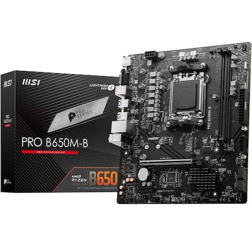 MSI Placa-mãe Pro B650M-B Micro ATX, compatível com processadores AMD Ryzen série 7000, AM5 - DDR5 Memory Boost 6800+MHz/OC, 1 x PCIe 4.0 x16, 1 x M.2 Gen4, LAN 2.5G - Ryzen 7000 PRONTO - A PRO B650M-B é uma placa-mãe Micro-ATX compacta equipada com o chipset AMD B650 (pronto para AM5, Ryzen 7000); O VRM possui tecnologia MSI Core Boost para melhorar a estabilidade e o desempenho - Refrigeração passiva e IA – dissipadores de calor de chipset fornecem resfriamento passivo; o resfriamento Frozr AI ajusta automaticamente as configurações do ventilador do sistema com base nas temperaturas da CPU e GPU - Memória DDR5, PCI-E 4.0 x16 SLOT - 2 x slots DDR5 DIMM SMT permitem memória de alta velocidade e melhoram a clareza do sinal (1DPC 1R, 6800+ MHz); O slot PCIe x16 primário suporta PCIe 4.0 (64GB/s) e inclui armadura de aço - CONECTOR GEN4 M.2 - As opções de armazenamento incluem 1 slot M.2 Gen4 x4 64Gbps para acesso SSD hiperrápido - Bem conectado – O hardware de rede inclui LAN de 2,5 Gbps; as portas traseiras incluem USB 3.2 Gen 1 Type-A (5Gbps), HDMI 2.1, VGA e áudio HD 7.1 com reforço de áudio