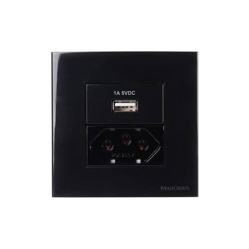 Placa para Móveis 80x80 com Tomada USB-A 1A 5W e Tomada 2P+T 20A MarGirius Sleek Preto Ebony