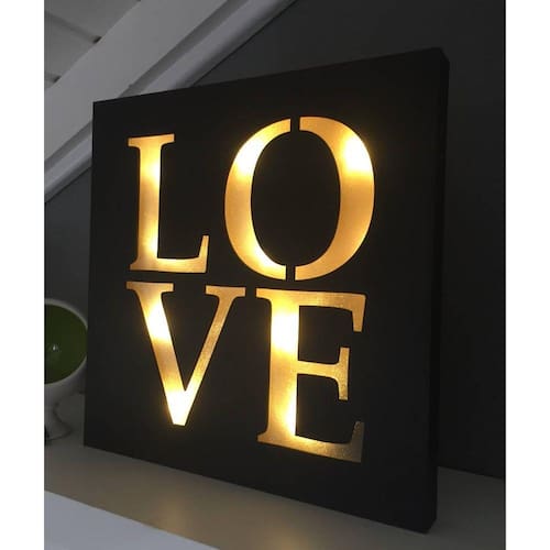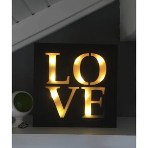 Placa Quadro Decorativo Love Iluminado a Led a Pilha 34 x 34cm Combine bom gosto em qualquer ambiente da sua casa com o quadro Love com Iluminação em Led. Esse artigo decorativo será a sintonia perfeita de harmonia, sofisticação e beleza que faltava em seu ambiente. Dê um toque mais que especial na decoração. Especificação: - Tamanho AxLxP: 34 x 34 x 3cm, - Fonte de energia: 3 pilhas AA (não inclusas), - Cor: Preto, - Composição: Madeira, Metal e Componentes Eletrônicos, - Peso: 690g. - Imagens Ilustrativas