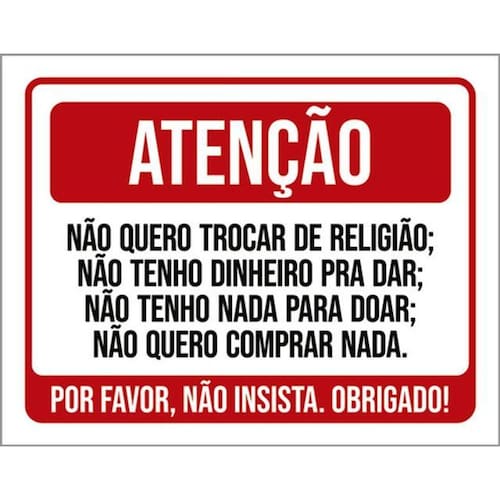 Placa Sinalização - Atenção Não Tenho Dinheiro 36x46 Placas de sinalizaço fabricadas com poliestireno de alto impacto PSAI de 2mm e impressão ultravioleta.