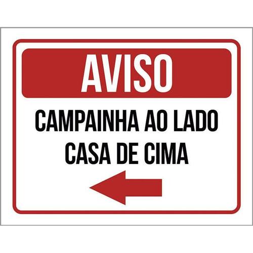 Placa Sinalização - Aviso Campainha Lado Casa Cima 36x46 - Informações do Produto: Placas decorativas fabricadas com poliestireno de alto impacto PSAI de 2mm e adesivo vinil automotivo de alta performance. - Medidas: 36cm x 46cm - Fixação: Todas as placas possuem adesivo dupla face para aplicação em qualquer tipo de superfície lisa. de 12 meses e disponibilidade imediata. Marca: Não Informado Ean: 7794882813379