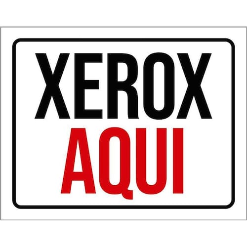 Placa sinalização - xerox aqui 18x23 Não precisa furar, não empena e nem perde a cor no sol, pode ser rebitada e não rasga - informações do produto: Placas decorativas fabricadas com poliestireno de alto impacto psai de 2mm e adesivo vinil automotivo de alta performance. - medidas: 18cm x 23cm - fixação: Todas as placas possuem adesivo dupla face para aplicação em qualquer tipo de superfície lisa. de 12 meses e disponibilidade imediata.