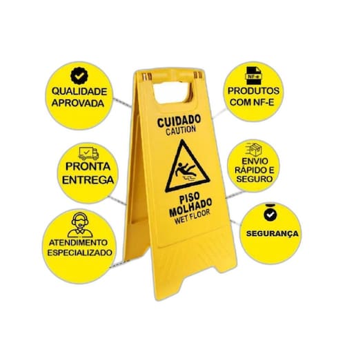 A placa sinalização piso molhado kit c/4 unidades é desenvolvida para prevenir acidentes em áreas que estejam sendo higienizadas ou para alertar sobre locais. Sendo assim fácil higienização, praticidade no transporte e utilização, além de material de alta resistência. Instruções de uso: Abrir a placa e colocar no piso na posição vertical; A placa deve ser disposta de forma a ficar bem visível a todas as pessoas que possam vir a transitar Próximas à área; Limpar e secar a placa após o trabalho. Especificações técnicas Marca: moppita Modelo: sb71005 Tipos de abertura: cavalete Cor: amarelo com escrita preta Utilização: pode ser instaladas em áreas externas, internas e banheiro Função: sinalizador atenção piso molhado Material: plástico injetado pp Placa sinalizadora - piso molhado Emitimos - Obs : a placa de sinalização não possui logo do fabricante Dimensões: - medida da placa aberta: alt.: 57cm x larg.: 30cm x profund.: 44cm - medida da placa fechada: alt.: 61cm x larg.: 30cm x profund.: 2,2cm