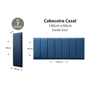 Placas Cabeceira Modulada Adesiva Casal Estofada 140cm x 60cm Kit 7 Placas - Suede AzulAs cabeceiras estofadas para cama box Flamingo Design trazem conforto e sofisticação para o seu quarto, tornando o ambiente mais aconchegante! As placas moduladas são uma ótima opção de decoração para você que quer praticidade na hora da instalação. Não é necessário furar a parede, as placas possuem fitas adesivas para fixação e você mesmo pode instalar facilmente!Nossos móveis são fabricados com materiais de alta qualidade e durabilidade, de fácil instalação e limpeza.A Flamingo Design te dá uma garantia de 3 meses contra qualquer defeito de fabricação!Confira abaixo mais detalhes sobre o produto:- Marca: Flamingo Design.- Modelo: Placa Modulada Adesiva.- Tamanho: Casal.- Qtd Peças: 7.- Comprimento Total: 140cm.- Altura: 60cm.- Largura (espessura): 26mm.- Material: MDF e espuma.- Fixação: Na parede com fita adesiva que já acompanha o produto.- Garantia: 3 meses.- Tecido: Suede.- Cor: Azul.Quantas placas você precisa para montar sua cabeceira?- Solteiro: 5 placas (100cm de largura).- Casal: 7 placas (140cm de largura).- Queen: 8 placas (160cm de largura).- King: 10 placas (200cm de largura).Como é feita a instalação?- Aplicar sobre a parede limpa (utilize um pano seco para remover qualquer poeira).- Faça as marcações na parede para auxiliar na instalação usando um nível ou fita métrica.- Observe as tramas do tecido para que todas as placas fiquem na mesma direção (veja a marcação atrás da cabeceira indicando o sentido).- Retire a proteção das fitas adesivas da placa.- Cole diretamente na parede uma placa de cada vez, pressionando por alguns segundos para garantir a colagem.Cuidados adicionais:- Instale as placas somente em paredes lisas. Não garantimos uma boa fixação em paredes com textura ou grafiato.- Pode ser colado em parede lisa, MDF, drywall, papel de parede liso (sem textura).- Para remover as placas utilize uma espátula e puxe com cuidado para descolar o adesivo (se desejar utilize um secador de cabelo para amolecer o adesivo).- As fotos são reais do produto. Podem ocorrer pequenas diferenças de cor devido ao tratamento de imagem e calibragem de cores do seu monitor ou celular.