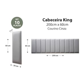 Placas Cabeceira Modulada Adesiva King Estofada 200cm x 60cm Kit 10 Placas - Courino CinzaAs cabeceiras estofadas para cama box Flamingo Design trazem conforto e sofisticação para o seu quarto, tornando o ambiente mais aconchegante! As placas moduladas são uma ótima opção de decoração para você que quer praticidade na hora da instalação. Não é necessário furar a parede, as placas possuem fitas adesivas para fixação e você mesmo pode instalar facilmente!Nossos móveis são fabricados com materiais de alta qualidade e durabilidade, de fácil instalação e limpeza.A Flamingo Design te dá uma garantia de 3 meses contra qualquer defeito de fabricação!Confira abaixo mais detalhes sobre o produto:- Marca: Flamingo Design.- Modelo: Placa Modulada Adesiva.- Tamanho: King.- Qtd Peças: 10.- Comprimento Total: 200cm.- Altura: 60cm.- Largura (espessura): 26mm.- Material: MDF e espuma.- Fixação: Na parede com fita adesiva que já acompanha o produto.- Garantia: 3 meses.- Tecido: Courino.- Cor: Cinza.Quantas placas você precisa para montar sua cabeceira?- Solteiro: 5 placas (100cm de largura).- Casal: 7 placas (140cm de largura).- Queen: 8 placas (160cm de largura).- King: 10 placas (200cm de largura).Como é feita a instalação?- Aplicar sobre a parede limpa (utilize um pano seco para remover qualquer poeira).- Faça as marcações na parede para auxiliar na instalação usando um nível ou fita métrica.- Observe as tramas do tecido para que todas as placas fiquem na mesma direção (veja a marcação atrás da cabeceira indicando o sentido).- Retire a proteção das fitas adesivas da placa.- Cole diretamente na parede uma placa de cada vez, pressionando por alguns segundos para garantir a colagem.Cuidados adicionais:- Instale as placas somente em paredes lisas. Não garantimos uma boa fixação em paredes com textura ou grafiato.- Pode ser colado em parede lisa, MDF, drywall, papel de parede liso (sem textura).- Para remover as placas utilize uma espátula e puxe com cuidado para descolar o adesivo (se desejar utilize um secador de cabelo para amolecer o adesivo).- As fotos são reais do produto. Podem ocorrer pequenas diferenças de cor devido ao tratamento de imagem e calibragem de cores do seu monitor ou celular.