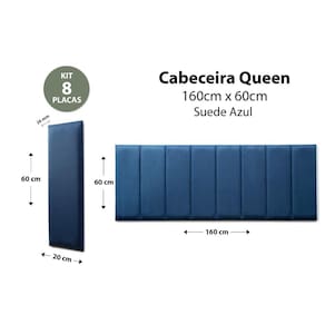 Placas Cabeceira Modulada Adesiva Queen Estofada 160cm x 60cm Kit 8 Placas - Suede AzulAs cabeceiras estofadas para cama box Flamingo Design trazem conforto e sofisticação para o seu quarto, tornando o ambiente mais aconchegante! As placas moduladas são uma ótima opção de decoração para você que quer praticidade na hora da instalação. Não é necessário furar a parede, as placas possuem fitas adesivas para fixação e você mesmo pode instalar facilmente!Nossos móveis são fabricados com materiais de alta qualidade e durabilidade, de fácil instalação e limpeza.A Flamingo Design te dá uma garantia de 3 meses contra qualquer defeito de fabricação!Confira abaixo mais detalhes sobre o produto:- Marca: Flamingo Design.- Modelo: Placa Modulada Adesiva.- Tamanho: Queen.- Qtd Peças: 8.- Comprimento Total: 160cm.- Altura: 60cm.- Largura (espessura): 26mm.- Material: MDF e espuma.- Fixação: Na parede com fita adesiva que já acompanha o produto.- Garantia: 3 meses.- Tecido: Suede.- Cor: Azul.Quantas placas você precisa para montar sua cabeceira?- Solteiro: 5 placas (100cm de largura).- Casal: 7 placas (140cm de largura).- Queen: 8 placas (160cm de largura).- King: 10 placas (200cm de largura).Como é feita a instalação?- Aplicar sobre a parede limpa (utilize um pano seco para remover qualquer poeira).- Faça as marcações na parede para auxiliar na instalação usando um nível ou fita métrica.- Observe as tramas do tecido para que todas as placas fiquem na mesma direção (veja a marcação atrás da cabeceira indicando o sentido).- Retire a proteção das fitas adesivas da placa.- Cole diretamente na parede uma placa de cada vez, pressionando por alguns segundos para garantir a colagem.Cuidados adicionais:- Instale as placas somente em paredes lisas. Não garantimos uma boa fixação em paredes com textura ou grafiato.- Pode ser colado em parede lisa, MDF, drywall, papel de parede liso (sem textura).- Para remover as placas utilize uma espátula e puxe com cuidado para descolar o adesivo (se desejar utilize um secador de cabelo para amolecer o adesivo).- As fotos são reais do produto. Podem ocorrer pequenas diferenças de cor devido ao tratamento de imagem e calibragem de cores do seu monitor ou celular. Marca: Flamingo Design
