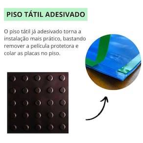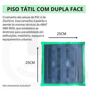 As placas de piso tátil são fabricadas em PVC, um material plástico durável e resistente ao desgaste. O PVC é leve e fácil de manipular, tornando a instalação mais conveniente. Cada placa segue as normas técnicas da ABNT NBR 9050 para acessibilidade em edificações e espaços públicos, medindo 25x25cm.
