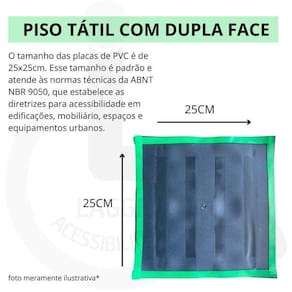 As placas de piso tátil são fabricadas em PVC, um material plástico durável e resistente ao desgaste. O PVC é leve e fácil de manipular, tornando a instalação mais conveniente. Cada placa segue as normas técnicas da ABNT NBR 9050 para acessibilidade em edificações e espaços públicos, medindo 25x25cm.
