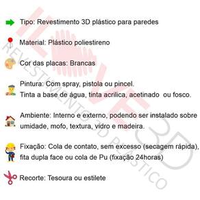 Com tamanho de 50x50cm, exceto para os modelos piramidal e prisma que possuem 48x48cm, e espessura de 1mm, essas placas são perfeitas para aplicação em áreas internas e externas. E o melhor de tudo: elas podem ser instaladas em paredes com umidade, mofo, textura, madeira e azulejo, sem quebra quebra e sem sujeira.