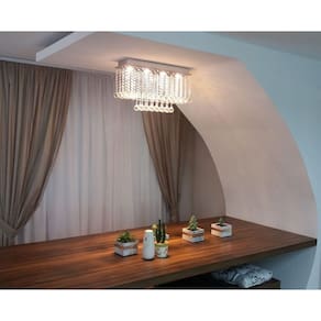 Material: Inox espelhado Medidas: 62x19cm x Altura: 30cm Cristal : Castanha 14mm e Globo 40mm Transparente Lâmpadas: 06 Lâmpadas Modelo GU10 Obs. Lâmpadas não inclusas no produto Compatível com Lâmpadas de Led GU10 Modelo: Sobrepor / Bivolt Peso: 9 kg : 90 dias contra defeito de fabricação