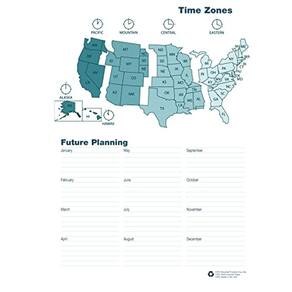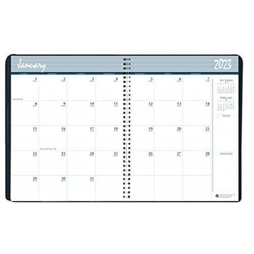 O planejador mensal Wirebound apresenta uma capa de couro simulada em relevo e de duas peças para um visual profissional. As páginas de planejamento variam 24 meses, de janeiro de um ano, de dezembro a dezembro do ano seguinte. Os spreads de duas páginas por mês incluem grandes blocos diários governados (2-1/8" x 1-7/8") para notas detalhadas; Férias; contagem de dias/dias restantes; Programação de domingo a sábado; uma área de notas governadas ao longo do lado; e referência de meses passados e futuros perto do canto superior direito. O planejador não recarregável é impresso com tinta de soja em papel feito com uma alta porcentagem de material reciclado.