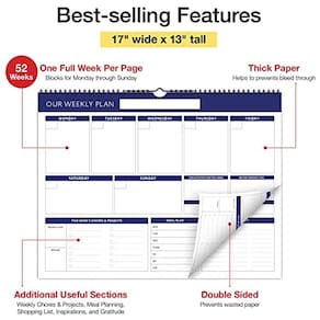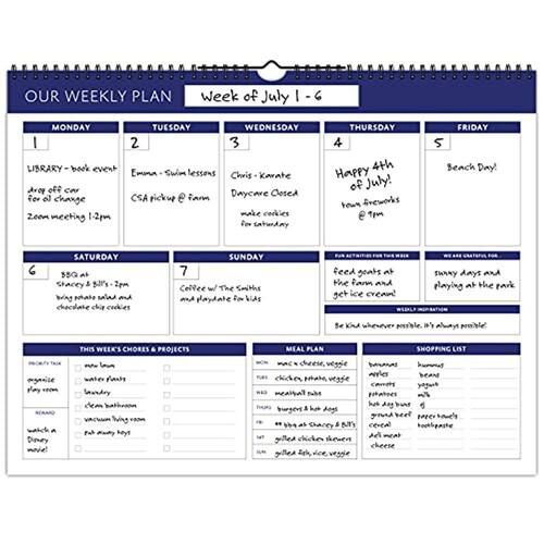 - Este planejador semanal inclui uma seção para cada dia da semana, juntamente com espaço para atividades, listas de compras, projetos, refeições e muito mais! Cada página apresenta um layout dedicado a planejar a semana inteira, ver os próximos eventos, atividades e listas de compras em um piscar de olhos! Com 13 x 17 polegadas, este planejador familiar diário ficará pendurado em qualquer parede ou ficará ótimo em qualquer mesa, o grande espaço de escrita oferece amplo espaço para toda a família escrever e gravar atividades!