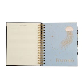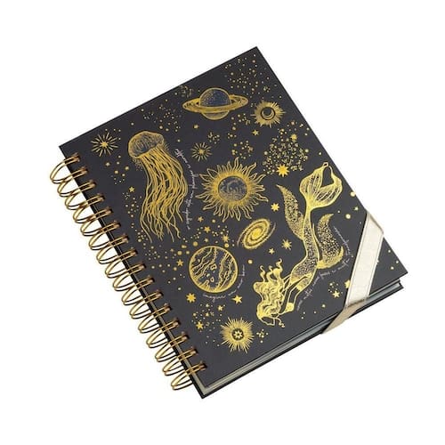 Contando com uma capa dura com uma linda e lúdica ilustração (uma mescla de elementos espaciais com elementos do fundo do mar) em foil dourado, ele também traz um elástico de fechamento na base.